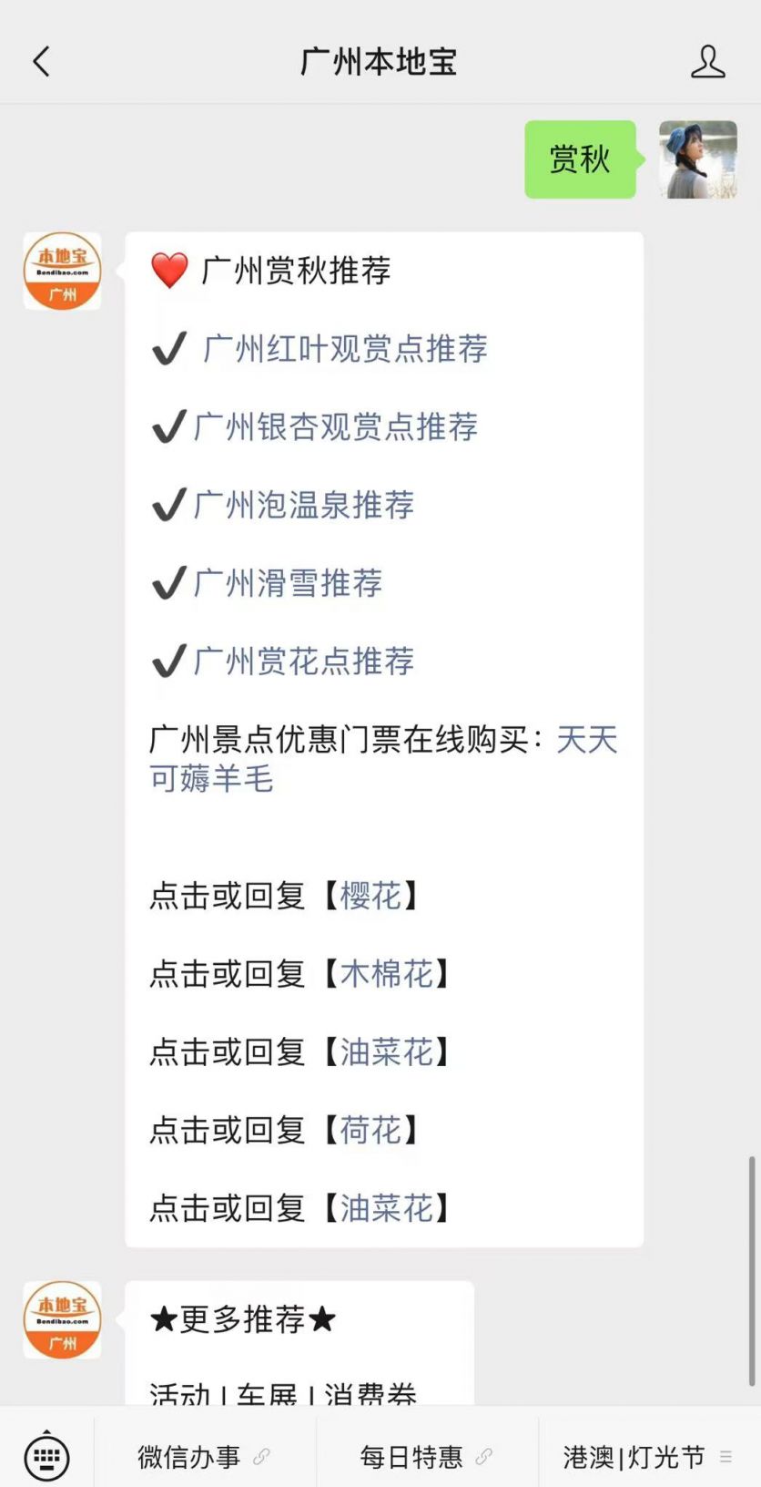 温馨提示:微信搜索【广州本地宝】公众号,关注后在对话框回复【赏秋】获取广州赏秋推荐(红叶、银杏等)、广州赏花点推荐(樱花、木棉花等)、广州滑雪、泡温泉推荐、广州景区优惠门票购买入口等!