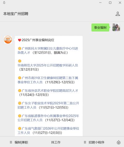 温馨提示:微信搜索公众号【本地宝广州招聘】,关注后回复【事业编制】,即可直接获取广州各事业单位/事业编制最新招聘信息,相关内容将持续更新。